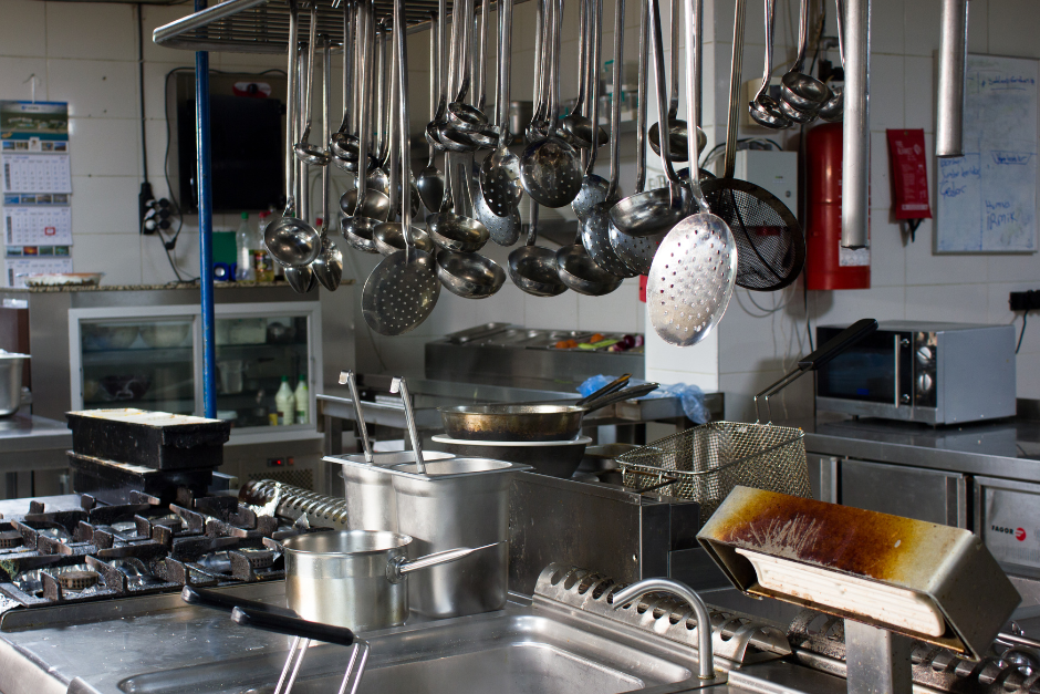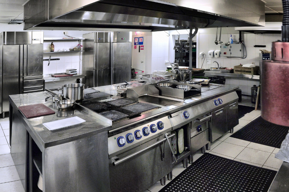 飲食店の厨房には、オーブンやフライヤー、食洗機、大型冷蔵庫など、たくさんの機器が並びます。