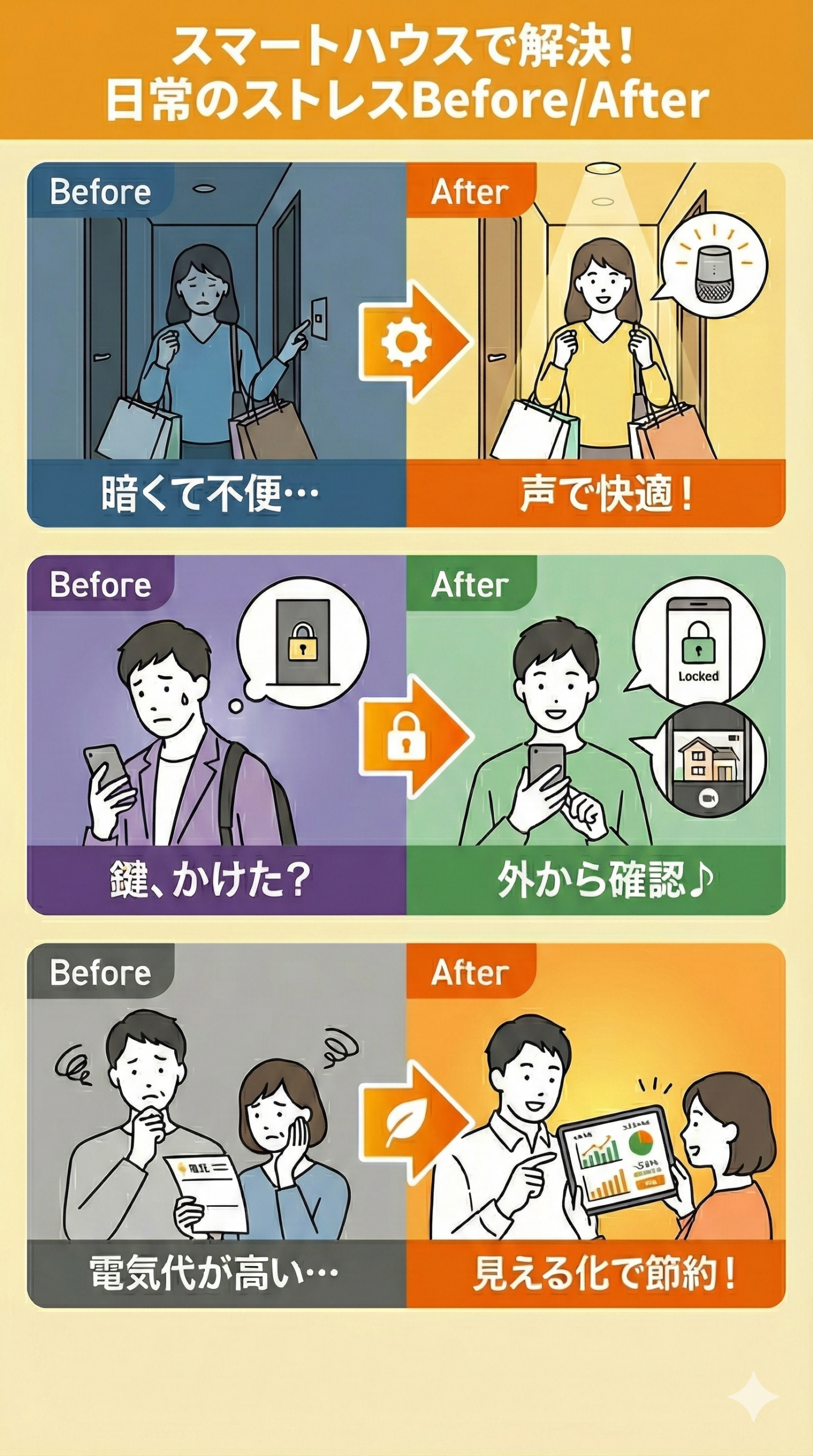 スマートハウスの魅力は、単に「便利」というだけではありません。 毎日の暮らしの中で感じる小さなストレスや不安を、自然に解消してくれることにあります。