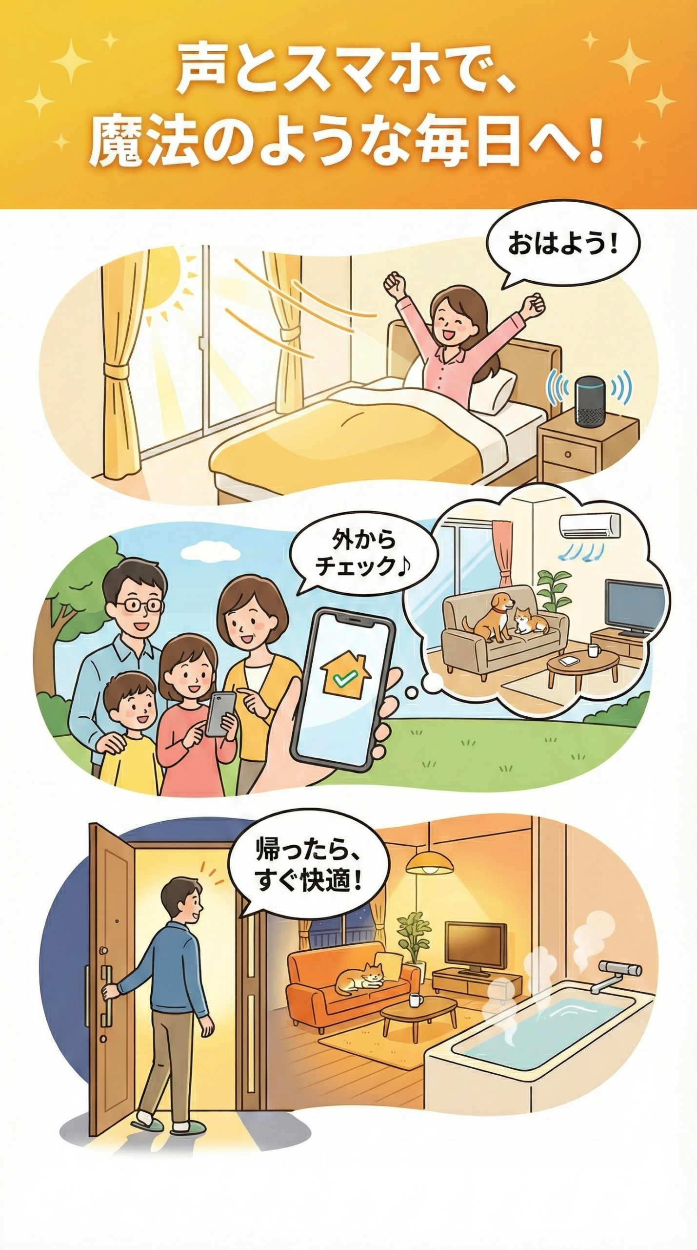 朝、「おはよう」の一言で部屋が明るくなり、帰宅前にスマホで照明とエアコンをつけておけば、疲れて帰ってきても快適な空間が待っている。 外出先で「鍵をかけたかな」と不安になることもなく、離れて暮らす家族の様子も見守ることができる。