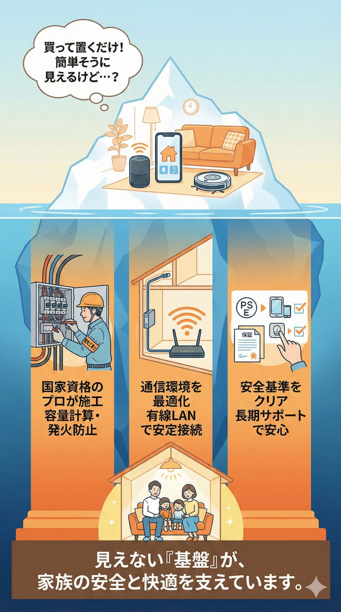 スマートハウスは、機器を買うだけでは完成しません。 家全体の電気の流れや通信環境を正しく整えてこそ、安全で快適な暮らしが実現します。